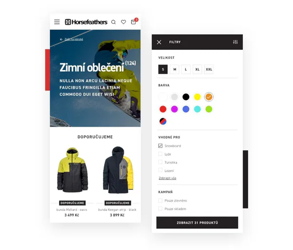 To je samozřejmě vtip. Horsefeathers má širokou cílovku. Jde primárně o milovníky adrenalinových sportů, kde se najdou různé věkové skupiny. Fakt je ale ten, že jsou to vždy velmi pokrokoví lidé, kteří mají rádi nové a rychlé věci. Proto jsme v mobilní verzi vychytali nejen filtrování, ale i katalog a detail produktu, aby si rideři mohli koupit novou bundu třeba ve frontě na vlek.